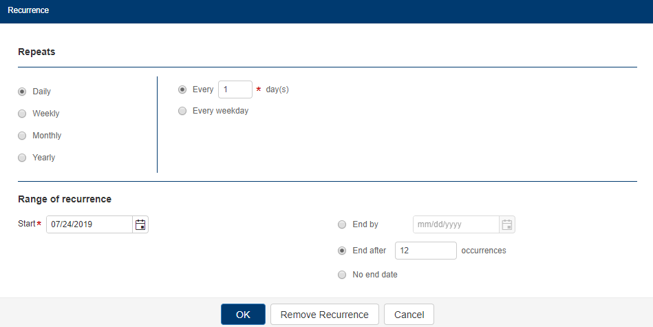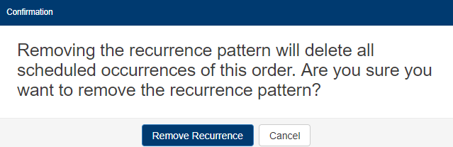 - Click Remove Recurrence to continue deleting or Cancel if you want to keep the series and return to the Recurrence window (step 3) to edit the series.