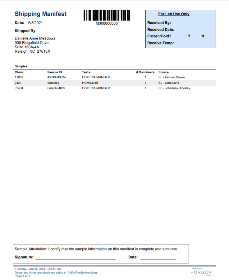 Displays a barcode of the manifest ID parameter. The ID is displayed in text below the barcode, and the current date or the latest collection date of samples is displayed. Also shows address information for the user. Includes space for laboratory to show who received the report and the date it was received. A sample grid includes details on each of the chains/samples included in the manifest report. |